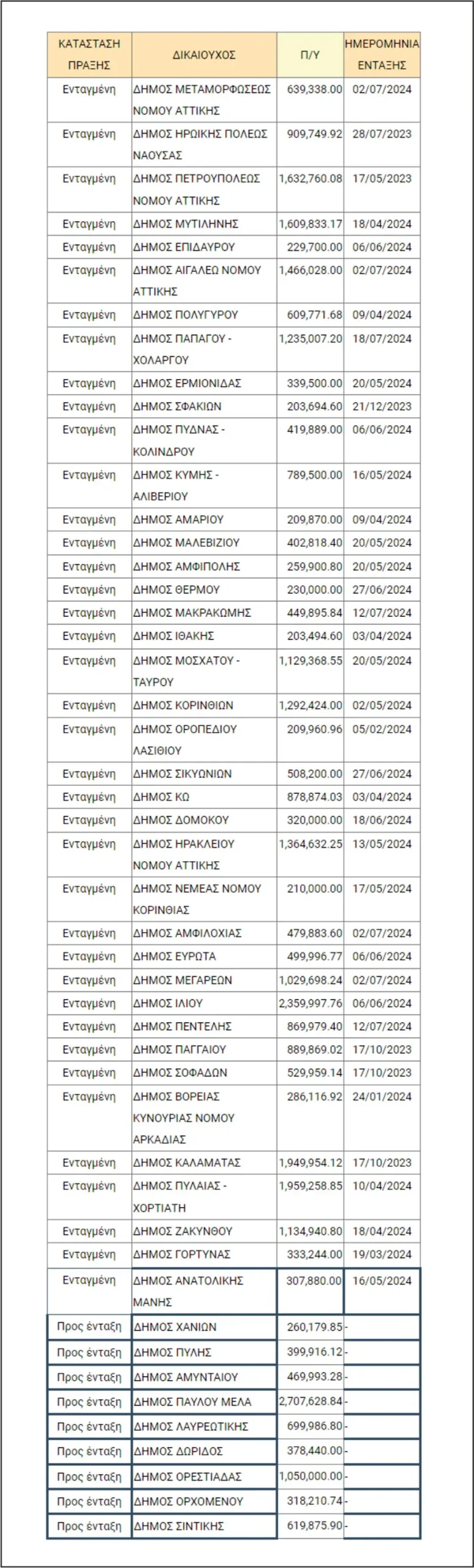 Ακολουθεί αναλυτικός πίνακας με τους Δήμους που εντάχθηκαν στο Πρόγραμμα «Ψηφιακός Μετασχηματισμός τον ΟΤΑ» και τον προϋπολογισμό ανά Δήμο: